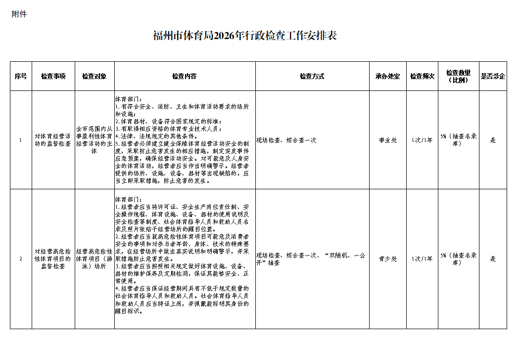 - 标 题: 福州市体育局关于印发《福州市体育局2026年行政检查工作计划》的通知